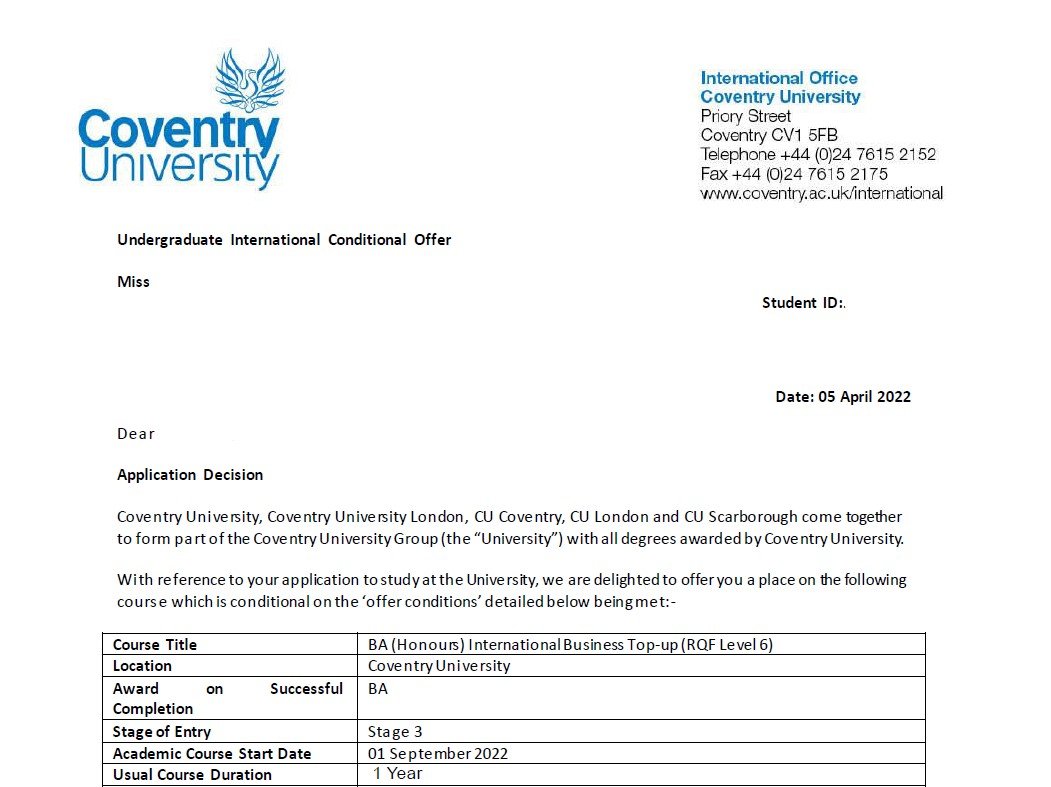 나○○학생의 Coventry University 입학을 축하합니다