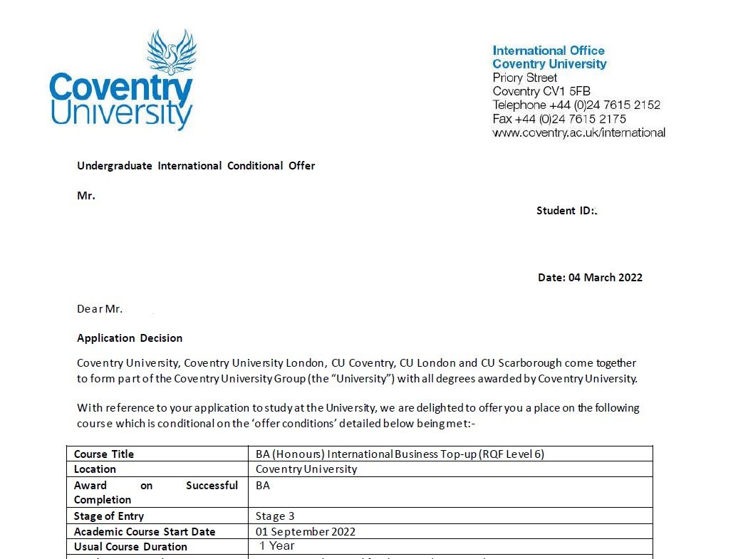 나○○학생의 Coventry University 입학을 축하합니다