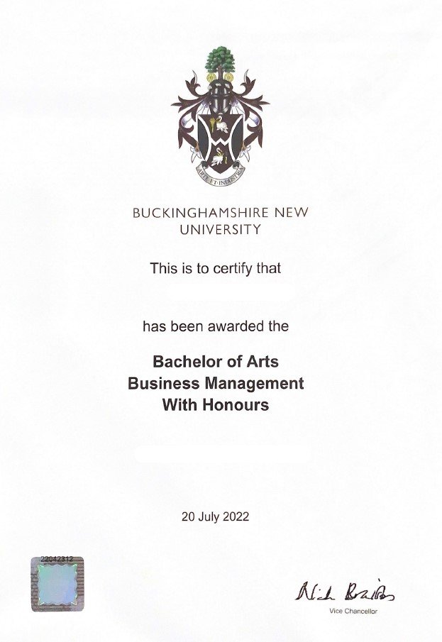 찬○○학생의 Buckinghamshire New University 졸업을 축하합니다