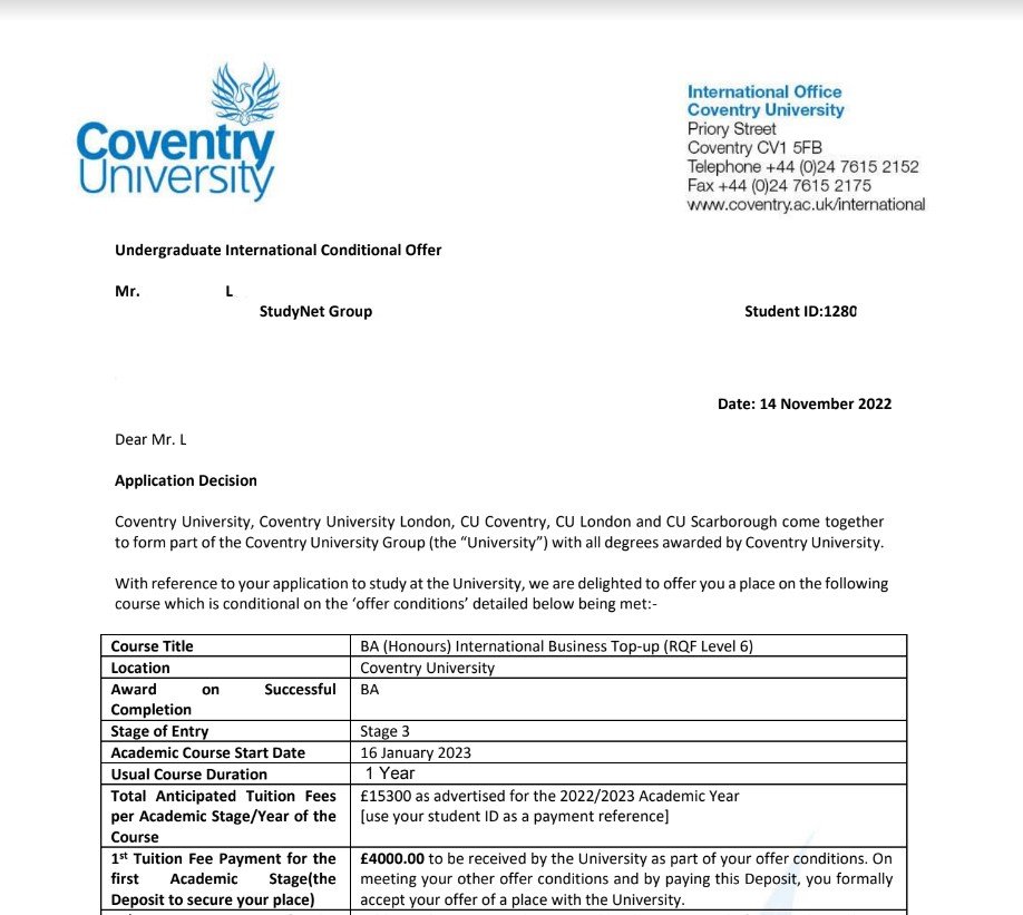 이○○학생의 Coventry University 합격을 축하합니다