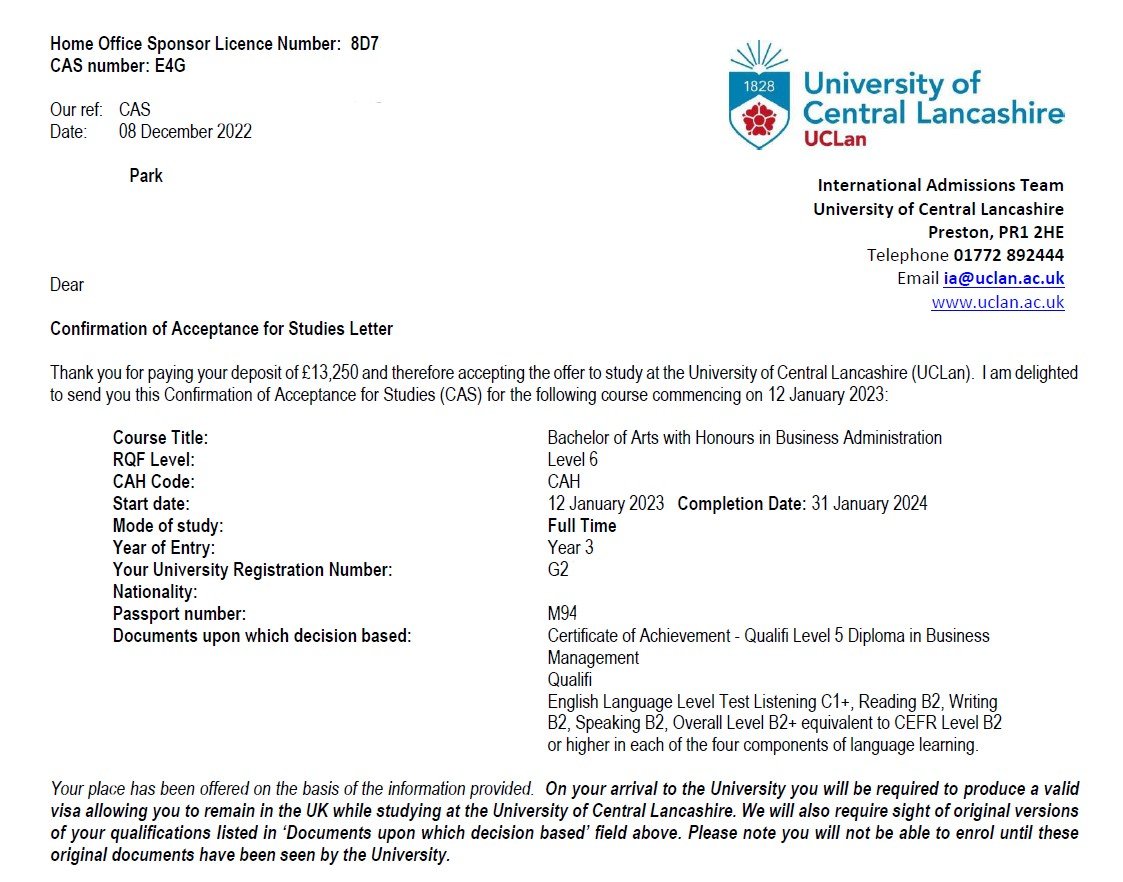 박○○학생의 University of Central Lancashire (UCLan) 합격을 축하합니다