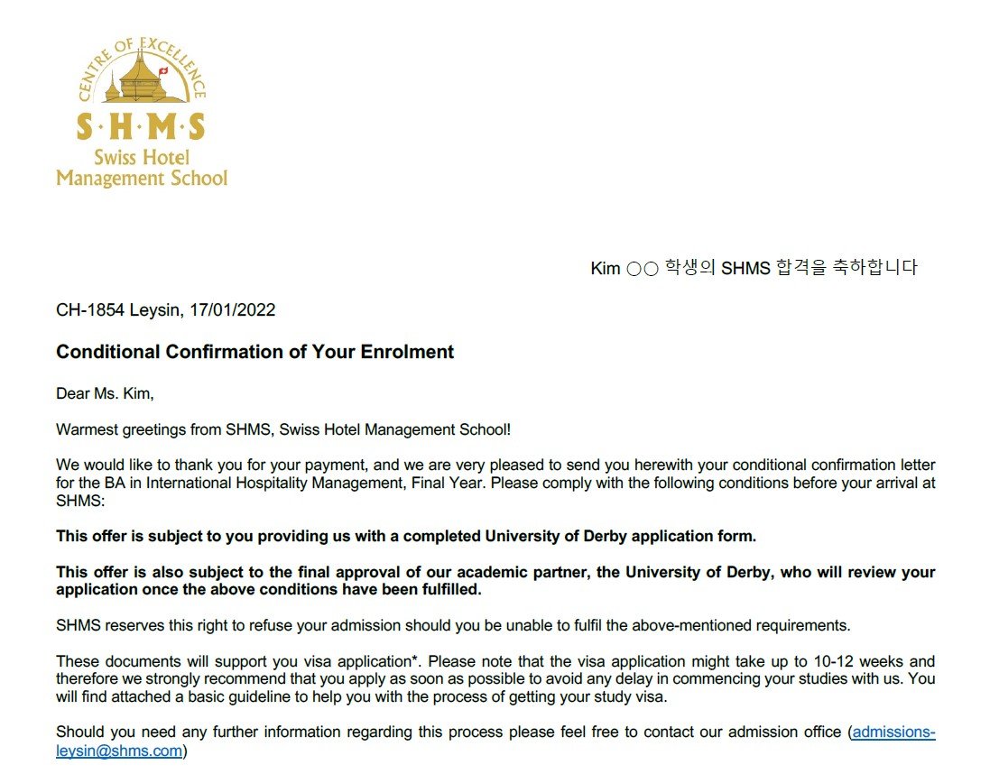 김○○학생의 SHMS 합격을 축하합니다