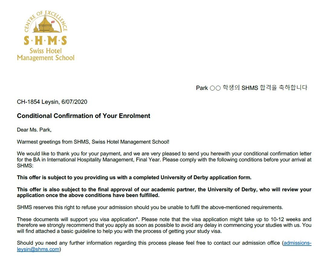 박○○학생의 SHMS 합격을 축하합니다