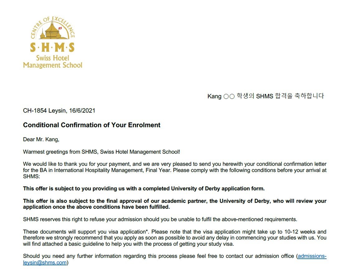 강○○학생의 SHMS 합격을 축하합니다