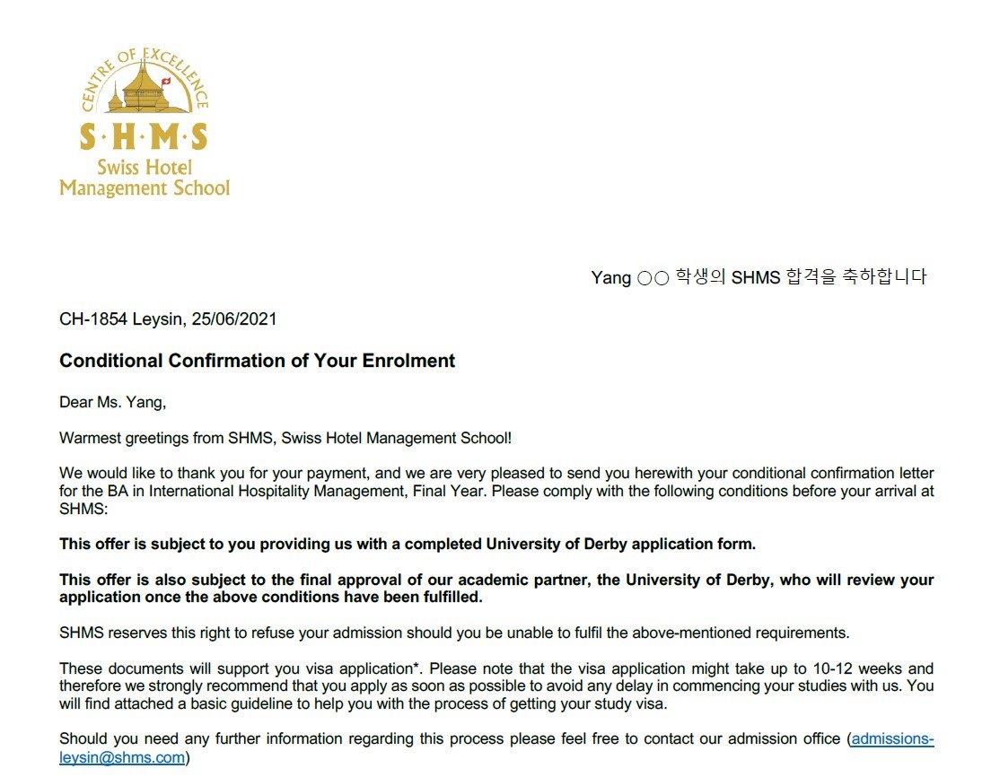 양○○학생의 SHMS 합격을 축하합니다