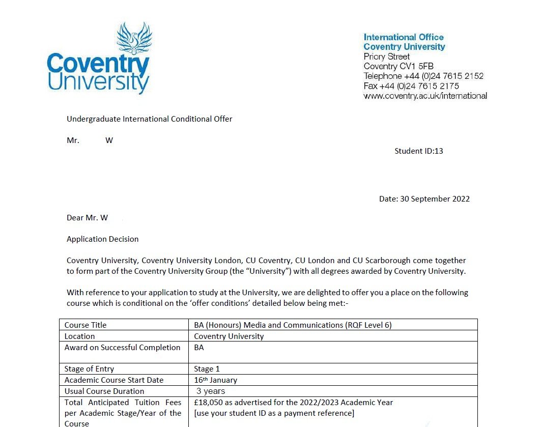 우○○학생의 Coventry University 합격을 축하합니다