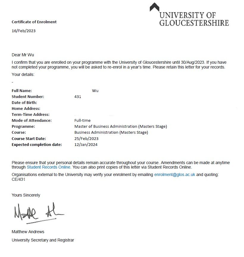 우○○학생의 University of Gloucestershire 입학을 축하합니다