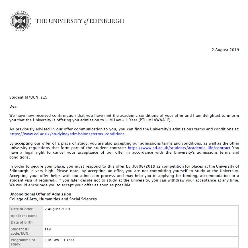 나○○학생의 The University of Edinburgh 입학을 축하합니다