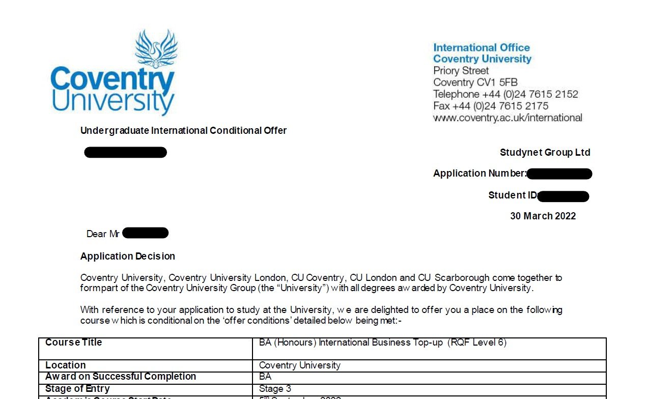 이○○학생의 Coventry University 합격을 축하합니다