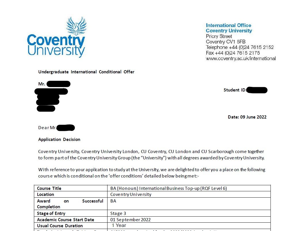 우○○학생의 Coventry University 합격을 축하합니다