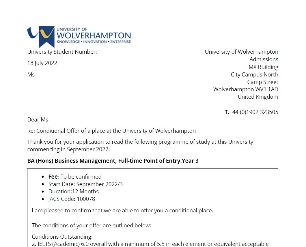 박○○학생의 University of Wolverhampton 합격을 축하합니다