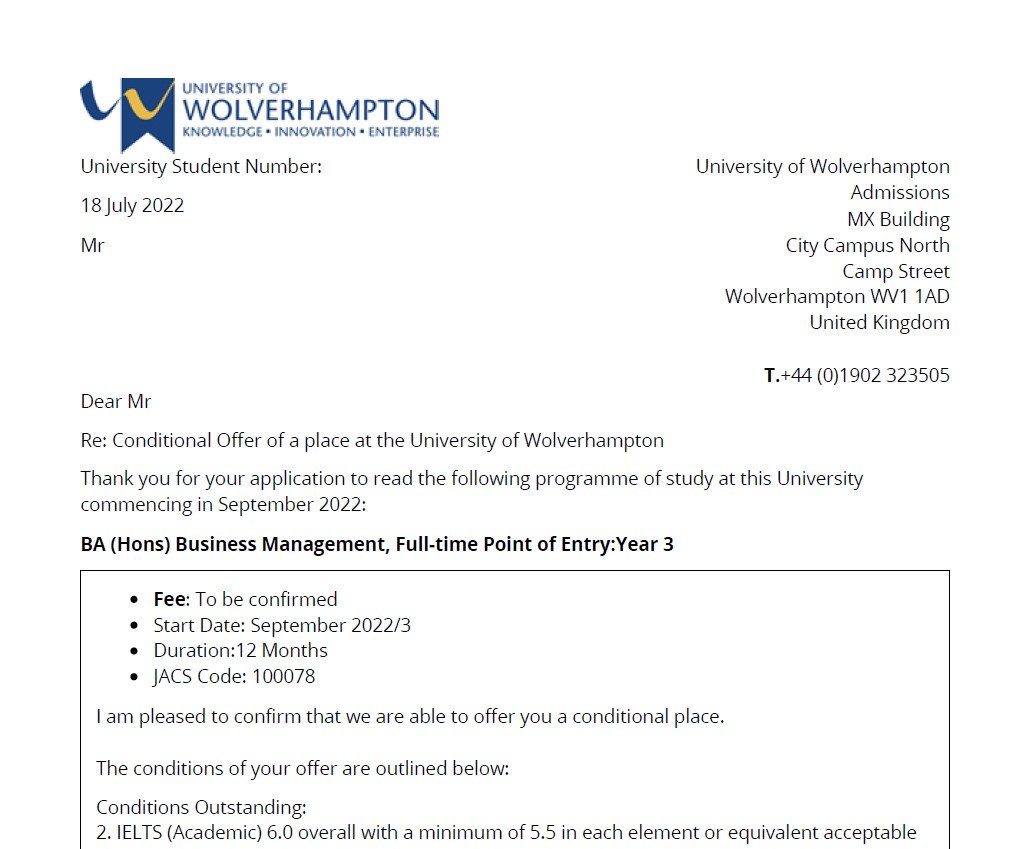이○○학생의 University of Wolverhampton 합격을 축하합니다